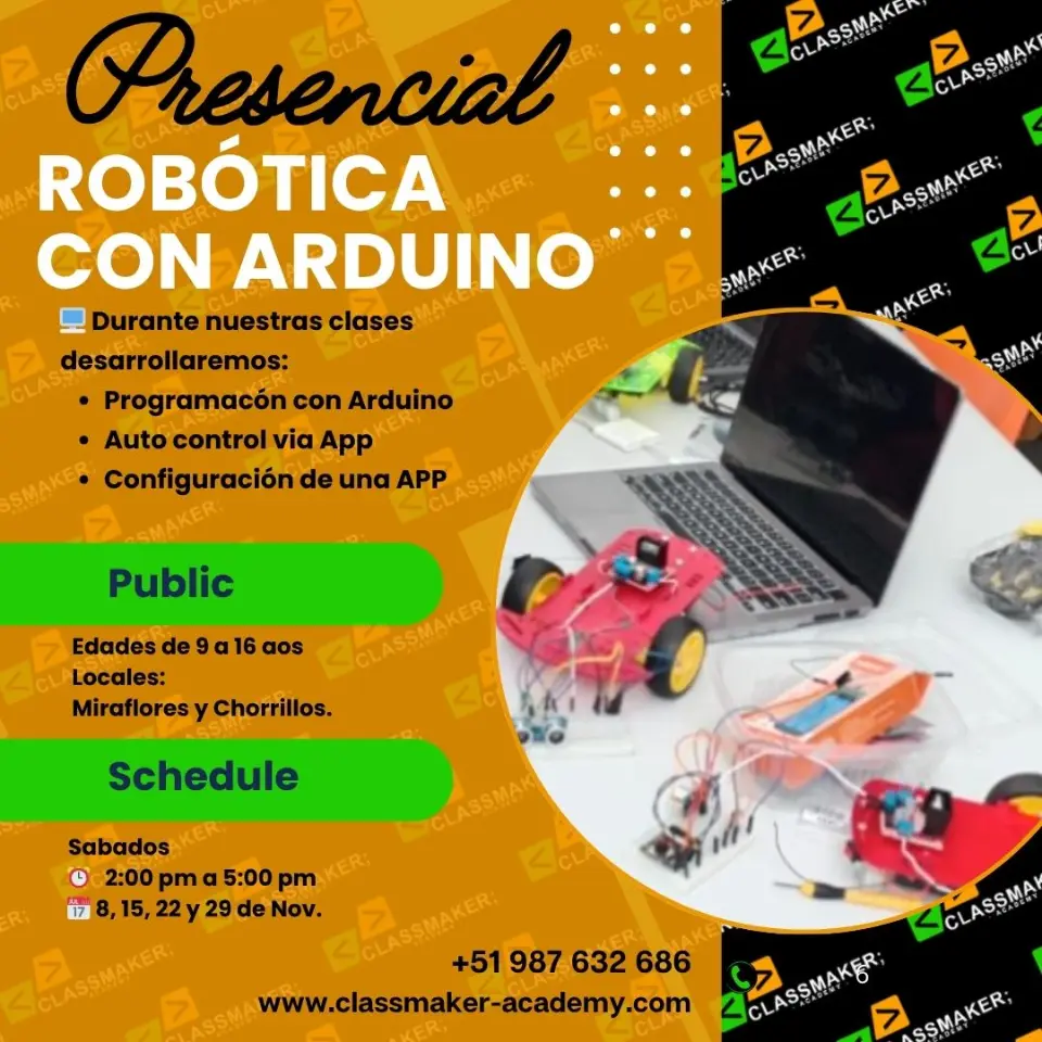 🖥️ Nuestra academia ofrece cursos robótica con arduino, para jóvenes de 8 a 17 años. Fomentamos el aprendizaje lúdico para desarrollar habilidades de lógica, creación e innovación. 🐍🕉️ Complete este formulario para inscribirse en nuestros cursos presenciales (face to face). Los primeros 15 alumnos por turno serán confirmados antes del 3NOV2025, y recibirán una clase de asesoría gratuita y materiales adicionales.